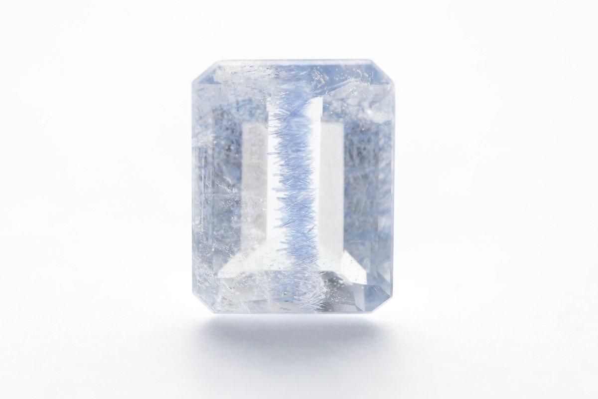 こちらは、水晶内に規律性のあるデュモルチェライトが連なる様に包有したユニークな逸品です。