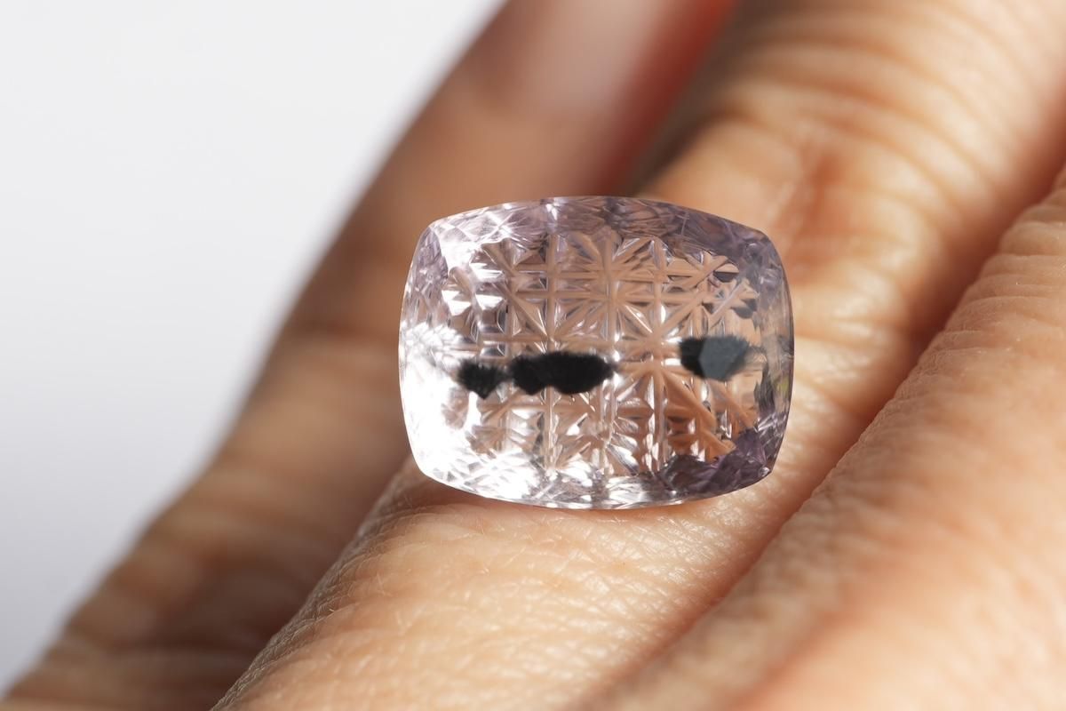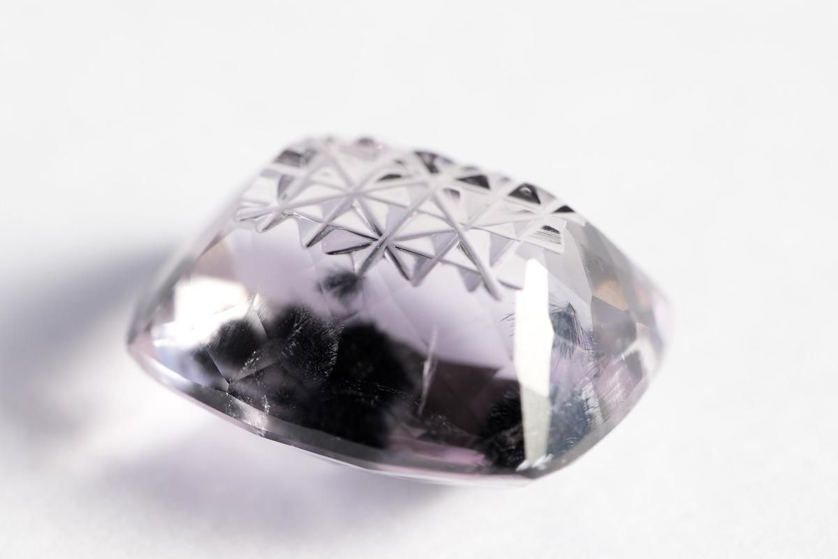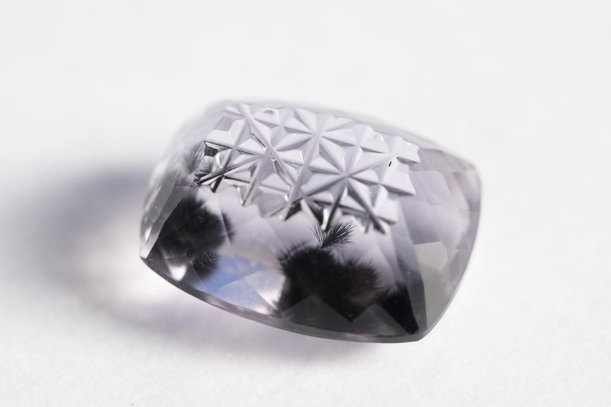 不純物の多いロマネサイトインアメシストの中でも非常に数の少ない極上品を用い製作依頼した''甲州貴石切子''との魅力が相まった美しいピース。